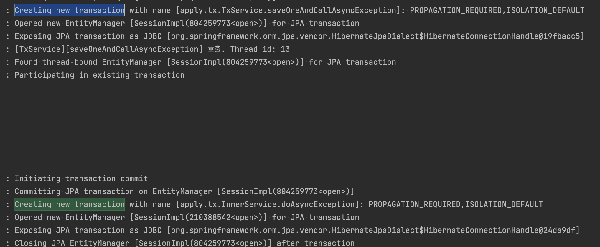 - TxService, InnerService 각각 다른 스레드 (Thread id: 13, Thread id: 25)