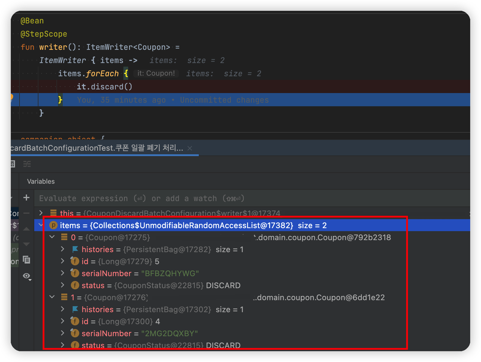 itemWriter가 2번 호출된 뒤 쿠폰의 상태가 바뀐 것을 확인할 수 있다.