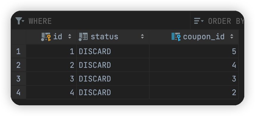 그런데 마지막 페이지, 청크에서 읽어들인 Id 1 쿠폰에 대한 변경사항이 DB에 반영되지 않은 것을 확인할 수 있다.