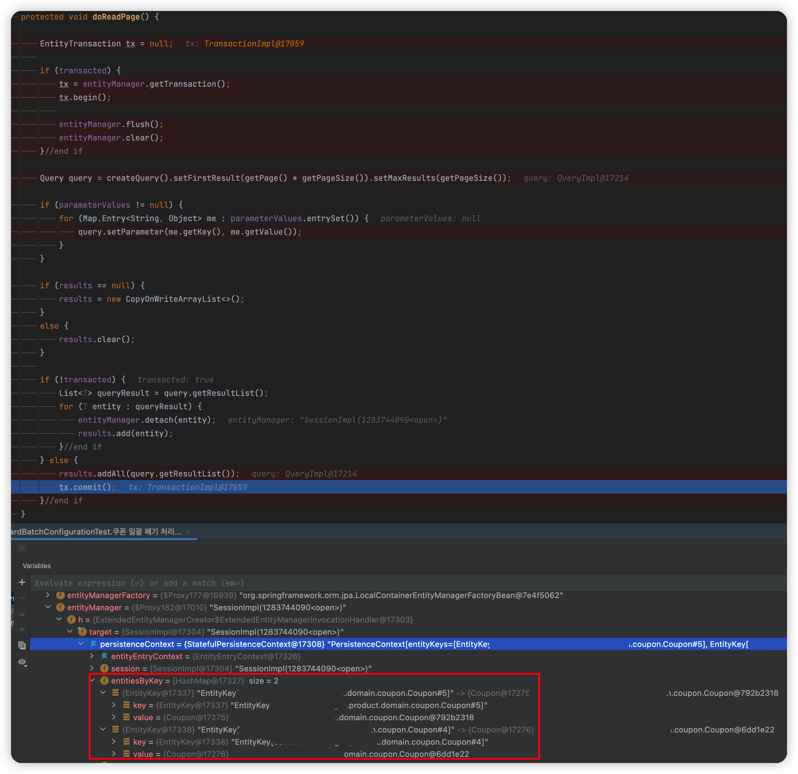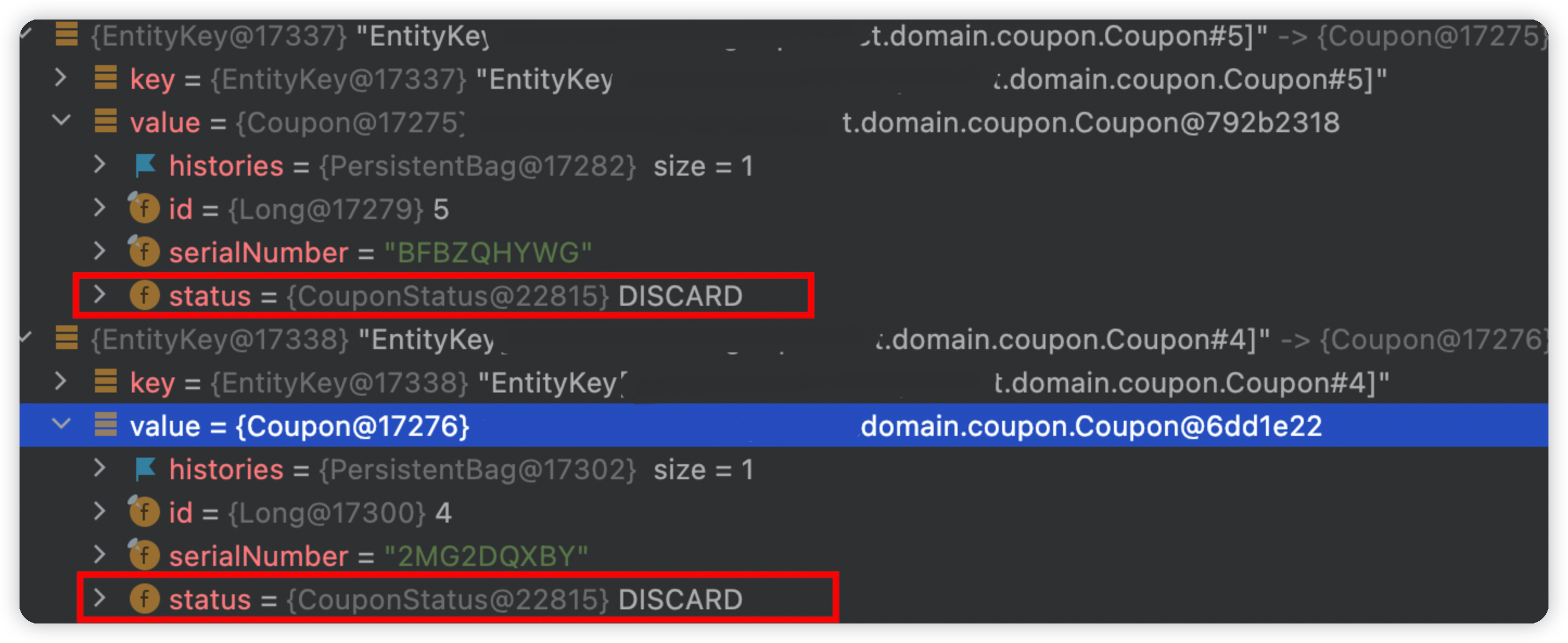 영속성 컨텍스트에는 페이지 사이즈만큼 읽어들인 쿠폰 5, 4에 대한 데이터가 올라가 있음을 확인할 수 있다.