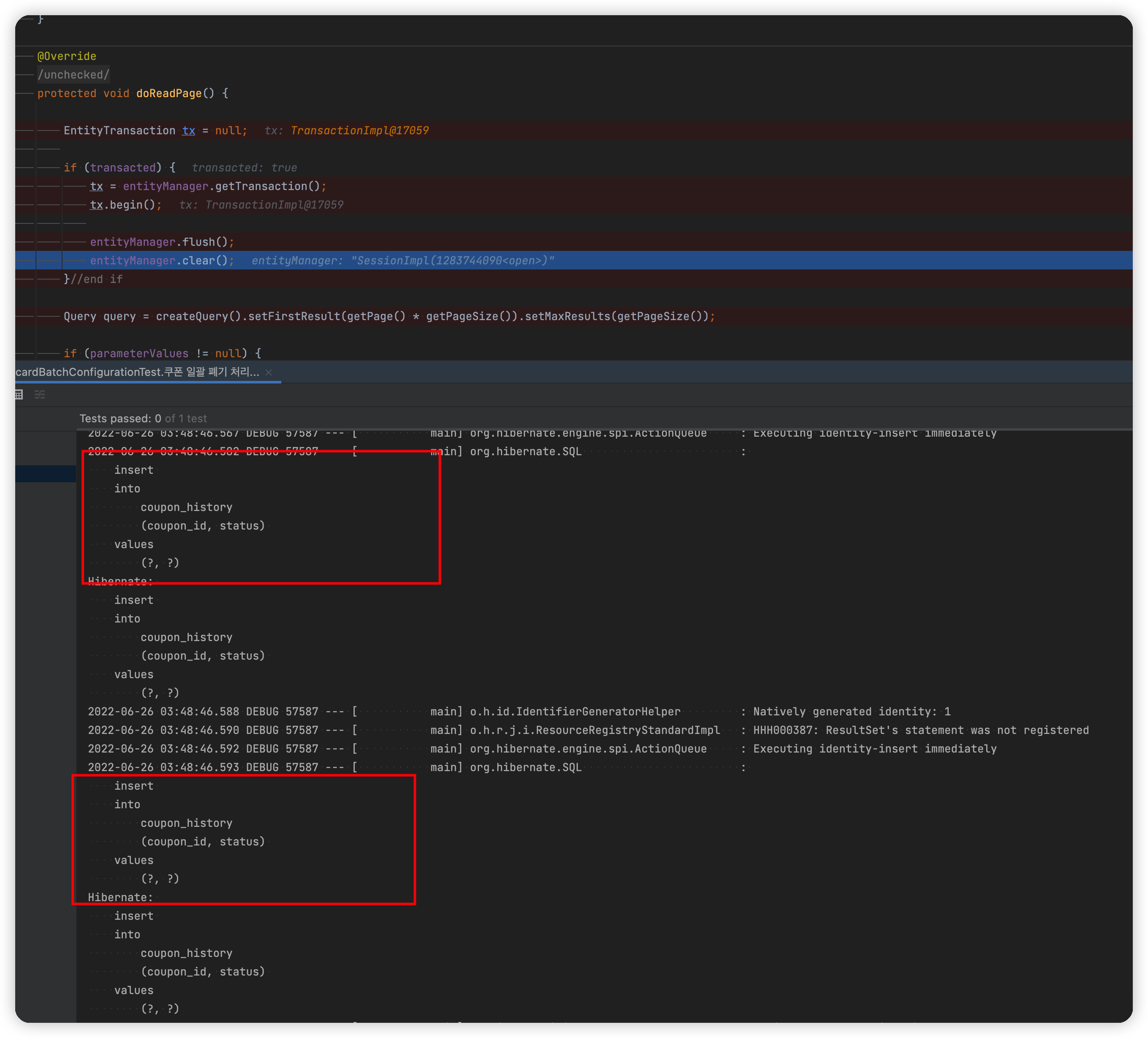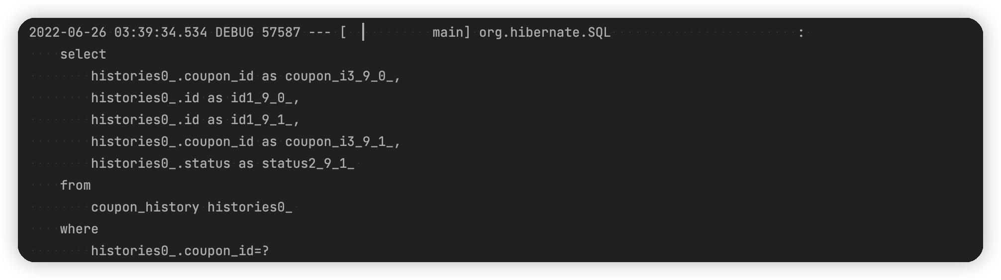 entityManager.flush()가 호출된 이 시점, 여기서 자식 엔티티인 history에 대한 insert 문, 쿠폰에 대한 update문이 발생하는 것을 볼 수 있다.