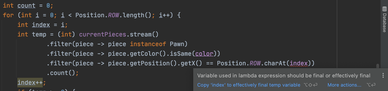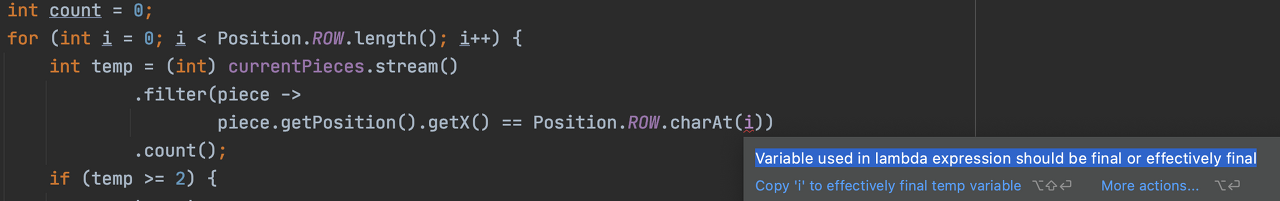 물론 위의 코드는 미션을 위해 일단 구현만을 목적으로 많은 리팩토링이 필요하니 참고 🥲 미션을 진행하다가 for 문 내에 stream을 쓰게 되었는데, i의 값을 람다식 내에서 사용하려니 컴파일 에러가 났다. "Variable used in lambda expression should be final or effectively final" 즉 람다식에서 사용되는 변수는 final이거나 effectively final이어야 한다.