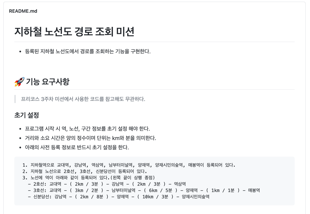 최종 테스트가 시작되고 미션에 대한 안내를 받았는데, 3차 과제를 응용한 지하철 노선도 경로 미션이었다. 사실 미션 주제를 보고 좀 많이 당황했었다. 제일 어려웠고, 많이 후회됐던 미션을 응용해서 테스트로 보게 될 줄은 생각도 못했었기 때문이다.