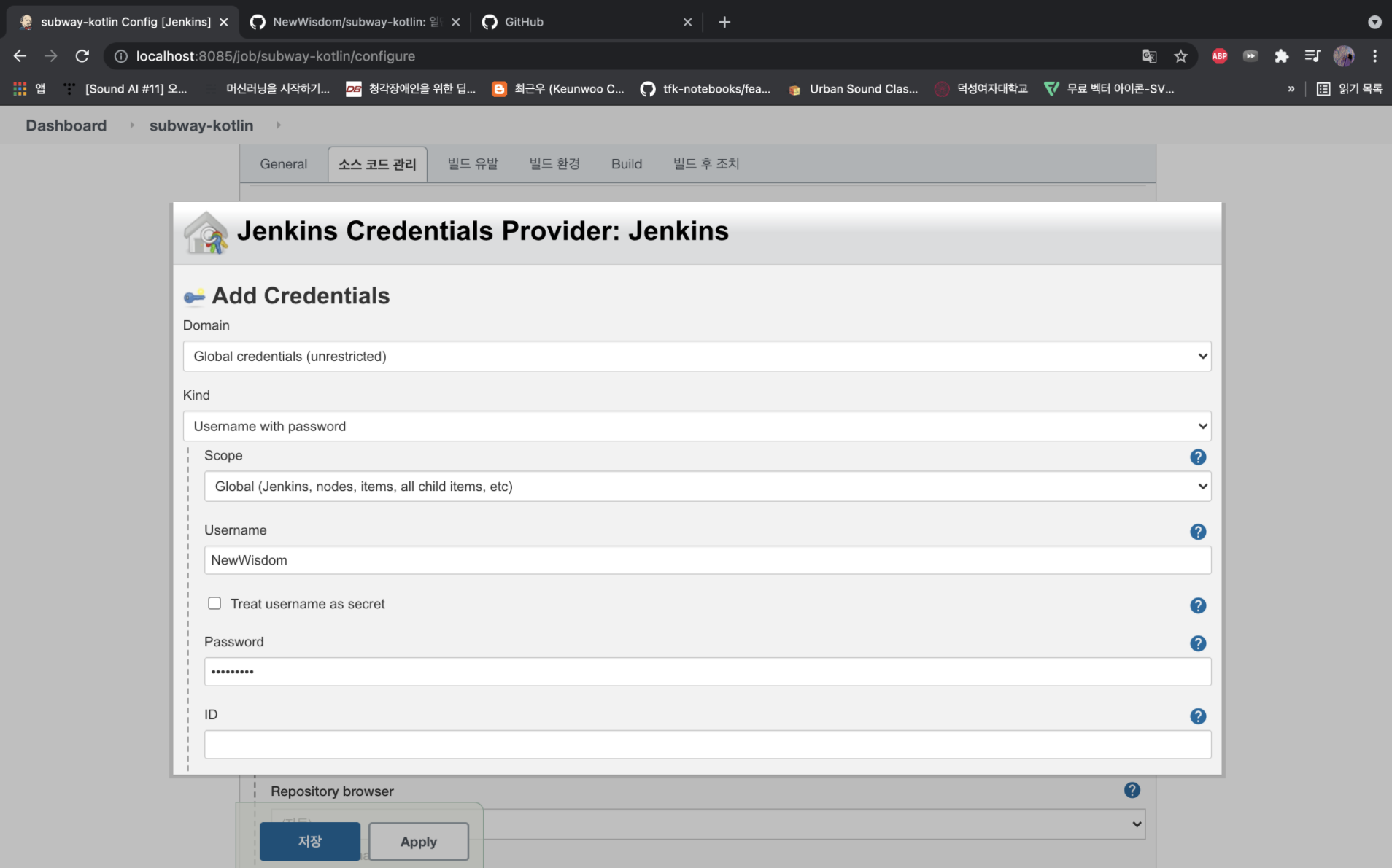 - 그리고 Credentials 에 있는 Add 버튼을 누르기