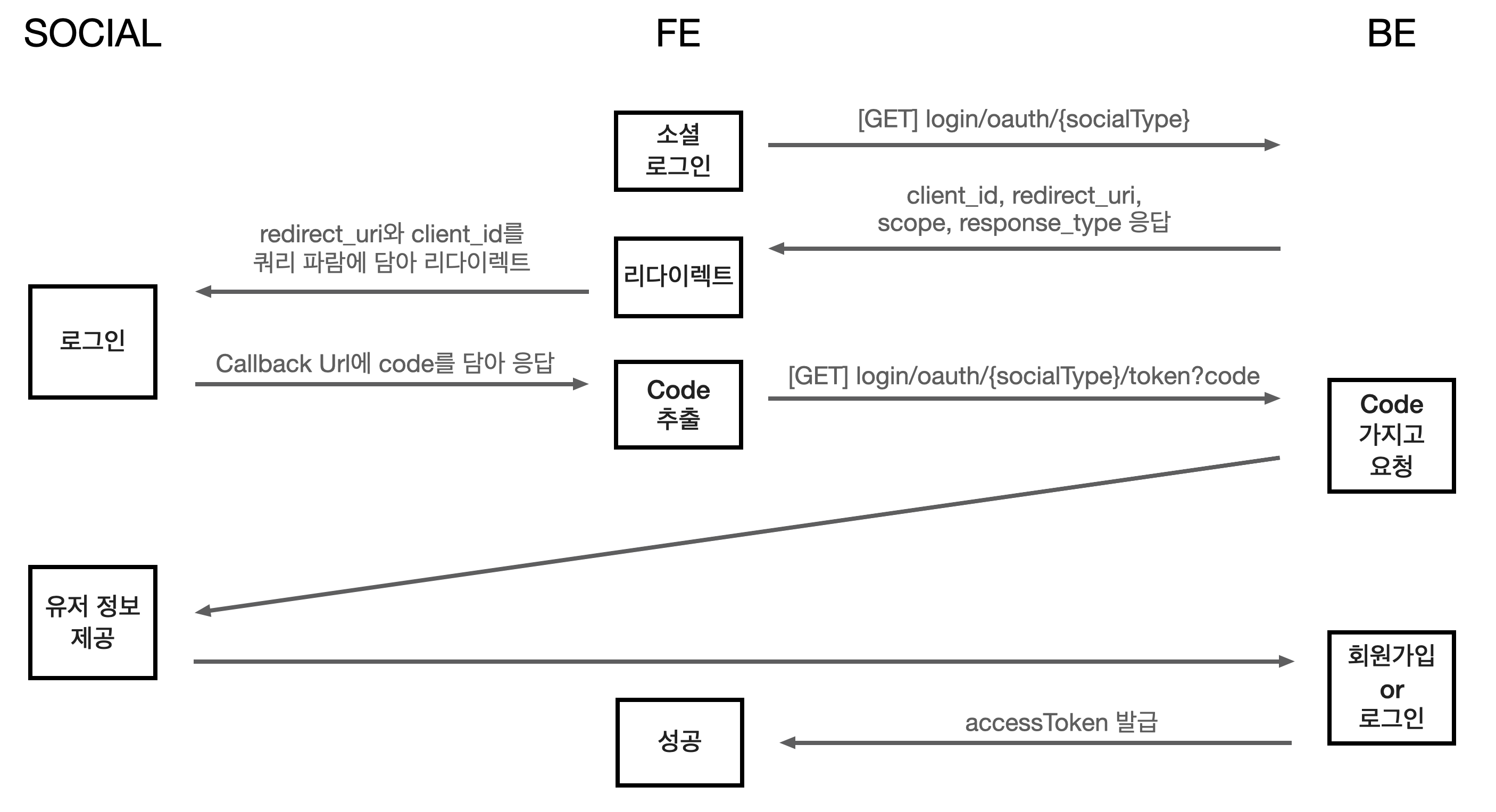 - 백엔드는 해당 code를 가지고 소셜에 유저 정보를 요청한다.